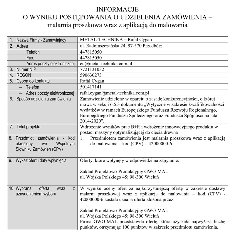 Informacja o wyniku postępowania – malarnia proszkowa