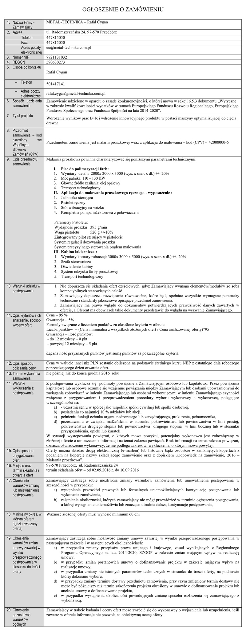 Ogłoszenie o zamówieniu – malarnia proszkowa