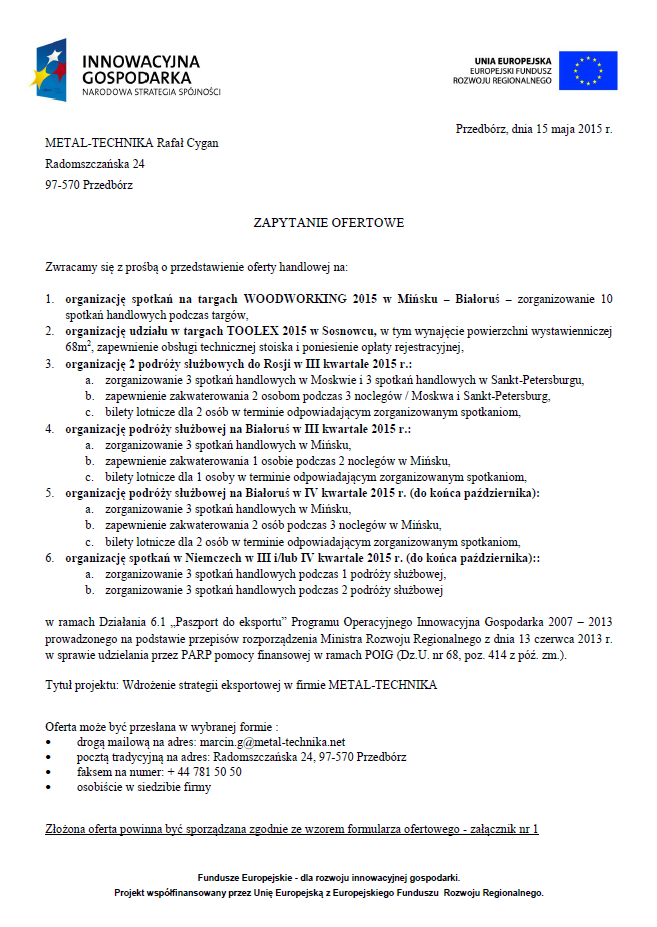 Zapytanie ofertowego na ostatnie działania w projekcie 6.1. POIG. Prośba o składanie ofert handlowych na organizację spotkań handlowych.